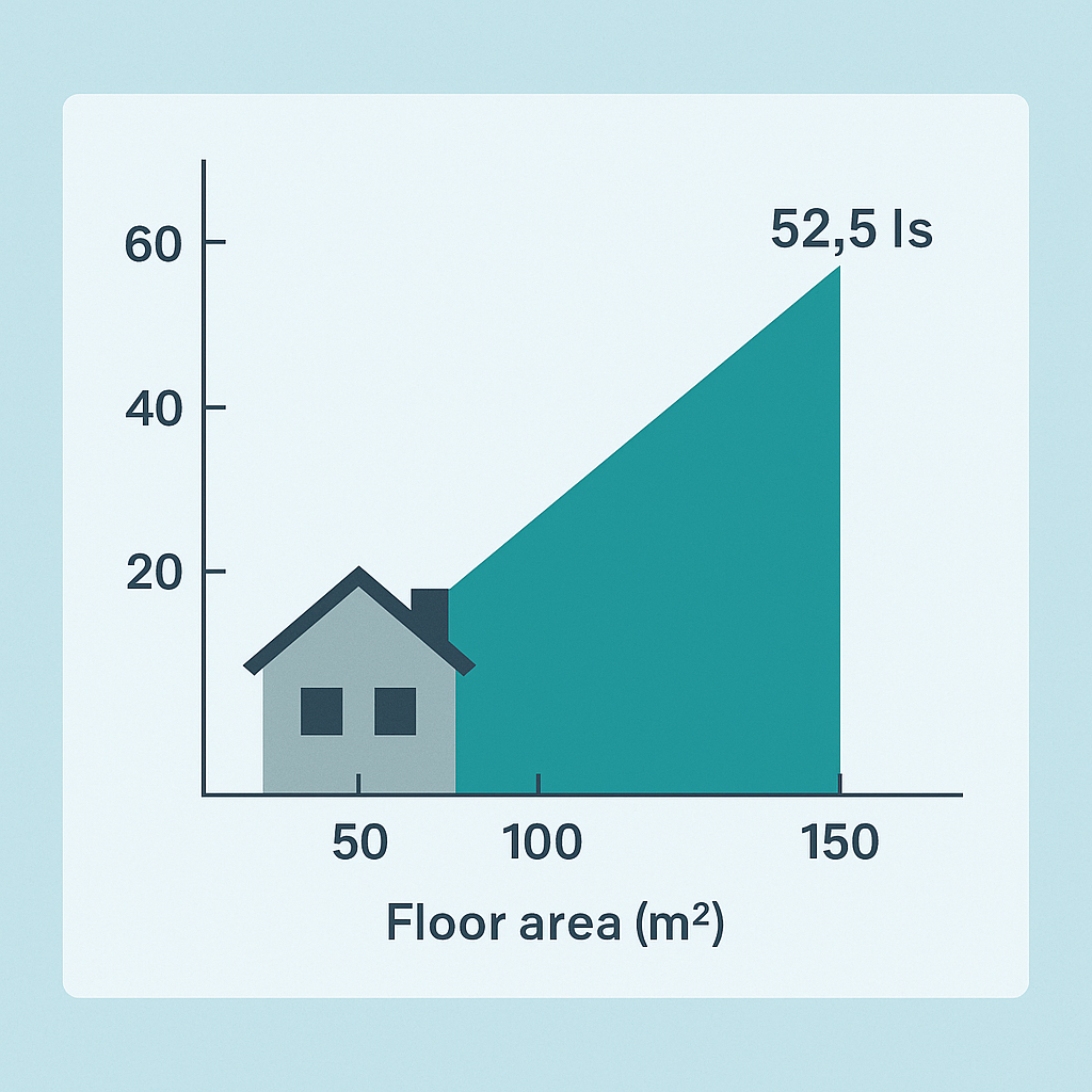 Exempel: Ett hus på 150 m² måste ha ett totalt luftflöde på minst 52,5 l/s.