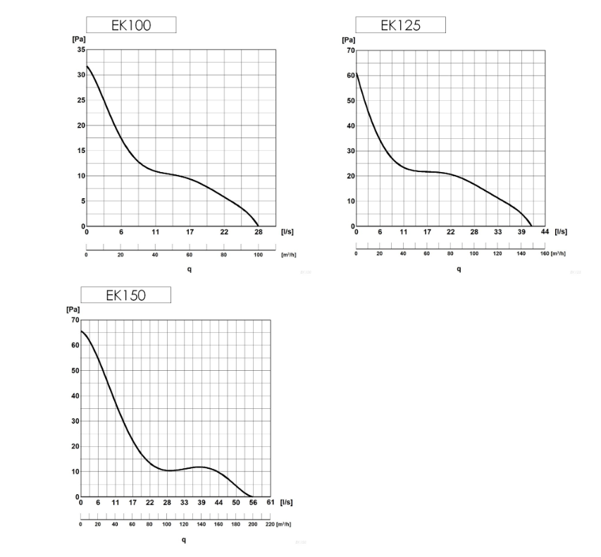 EUROPLAST EK-serien är kompakt och effektiv kanalfläkt i vit ABS-plast, idealisk för badrum, kök och tvättstugor. Finns i storlekarna Ø100 mm, Ø125 mm och Ø150 mm med luftflöden på 100–200 m³/h och låg ljudnivå från 32–40 dB(A). Modellerna kan ha inbyggd timer (EKxxxT) för fördröjd avstängning, monteras horisontellt i runda kanaler och har glidlager för tyst och pålitlig drift.