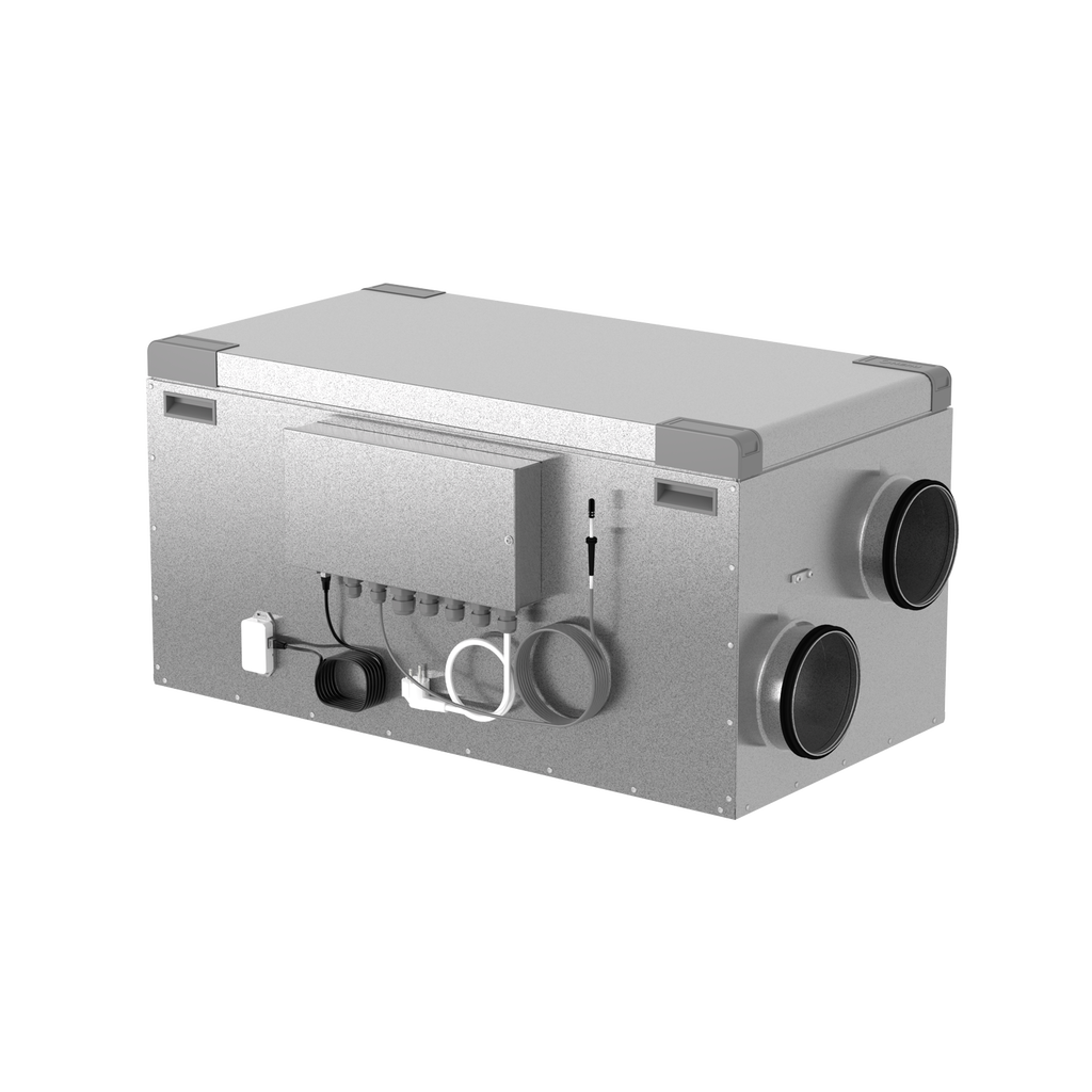 Luftflödet genereras av två tystgående radialfläktar med EC-motorer och bakåtböjda skovlar. Fläktarna är anslutna med snabbkontakter och är lätta att ta ur för rengöring. Aggregatet har en unik design som minimerar köldbryggor, och är tillverkat i galvaniserad stålplåt med 50 mm isolering för optimal ljuddämpning och energieffektivitet.