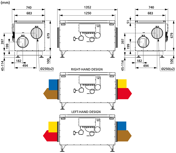 HERU 300 S EC-y2 levereras med sidoanslutningar och är anpassat för installation i både varma och kalla utrymmen. Aggregatet levereras med kabel för fast installation och har en inbyggd elektrisk eftervärmare på 2300 W. Högerutförande är standard men enheten kan enkelt byggas om till vänsterutförande.