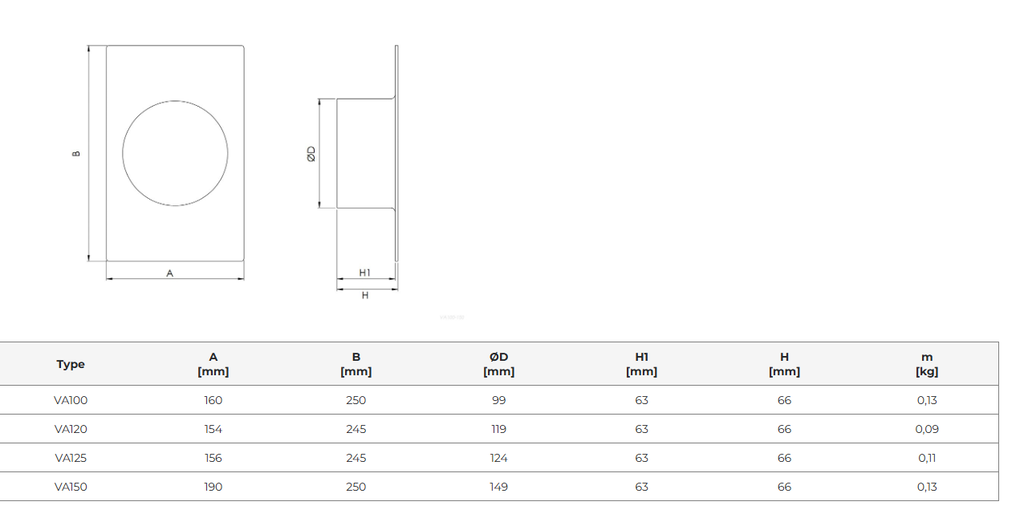 | VA125 | Plastadapter, 160x250mm, Ø125mm | Ø125 mm | 4750492000274 |
