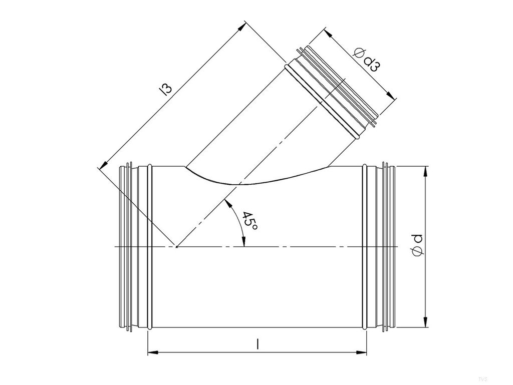 TVS-serien finns i flera dimensioner för ventilationsrör. Välj den kombination av huvuddiameter (Ød) och avstick (Ød3) som matchar din kanaldragning. Vanliga söktermer är t-rör spirorör, trestycke ventilation, t-stycke 45 grader och ventilationsrör t-rör med packning.