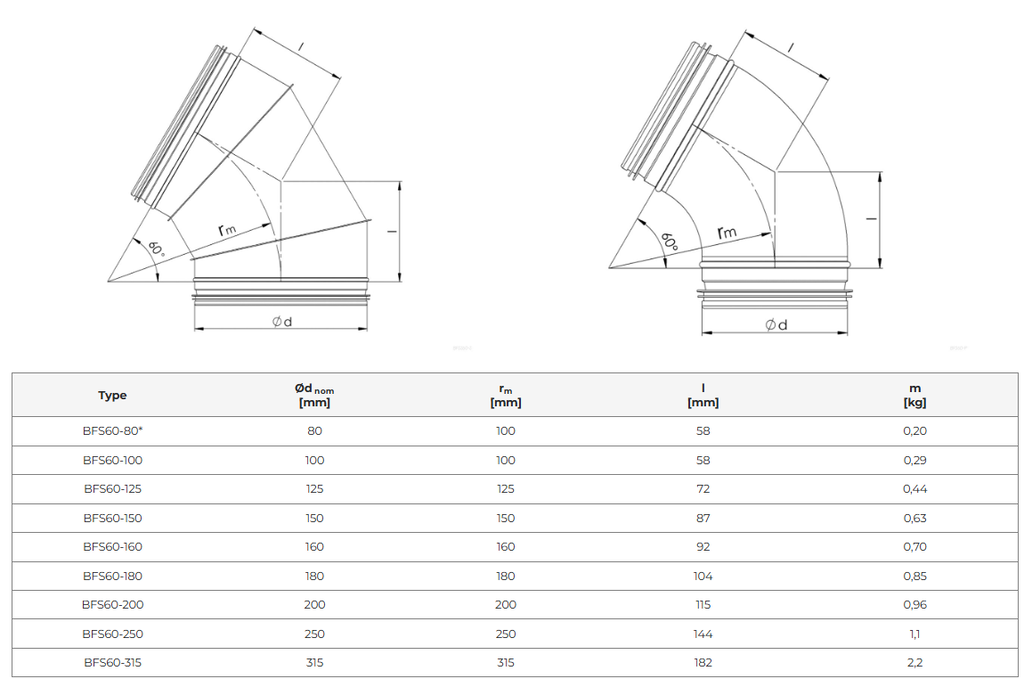 | BFS60-200 | 60° böj Ø200 mm med gummitätning | 200 mm | 200 mm | 115 mm | 4750492001042 | 0,96 kg |