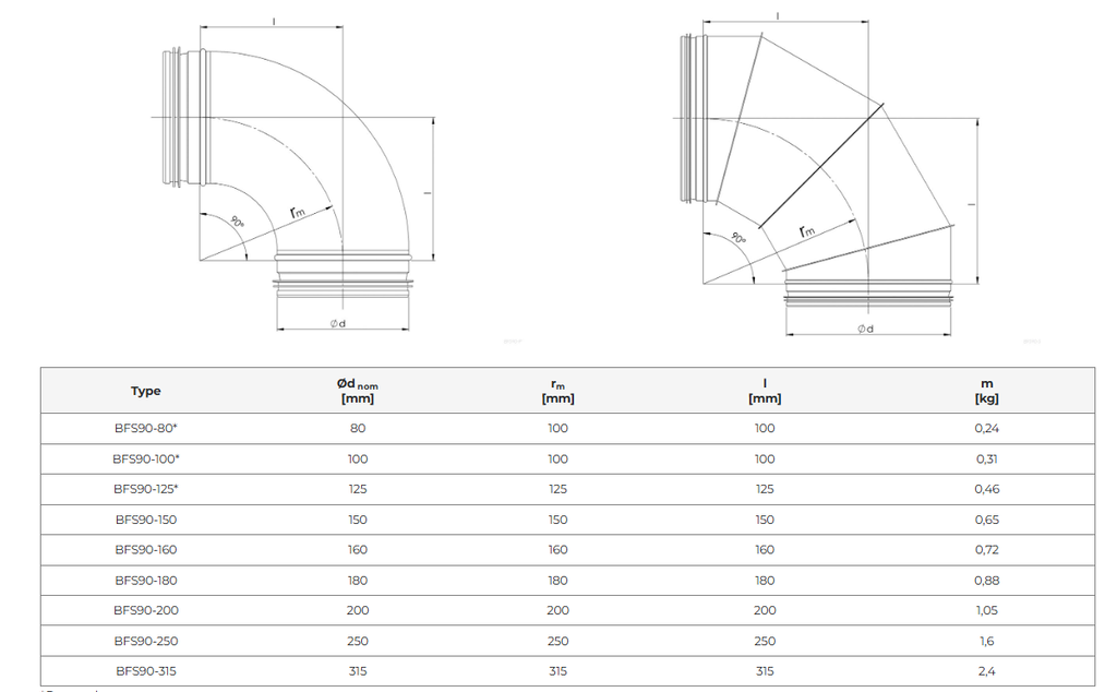 | BFS90-315 | 90° böj Ø315 mm med gummitätning | 315 mm | 315 mm | 4750492106785 | 2,4 kg |