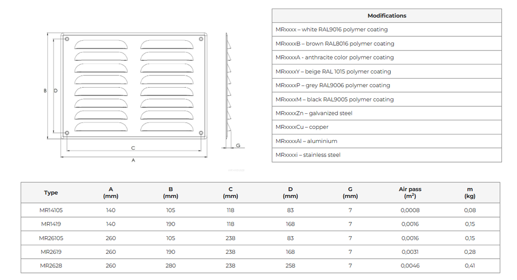 Dessa MR-ventilationsgaller i metall har inbyggt insektsskydd och passar både inomhus- och utomhusbruk. Finns i galvaniserat stål, koppar, aluminium eller rostfritt stål, med färger som vit, brun, antracit, beige, grå och svart, och i storlekar från 140×105 mm upp till 260×280 mm.