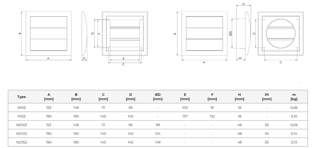ND15Z: A: 190 mm, B: 190 mm, C: 140 mm, D: 140 mm, ØD: 149 mm, H: 48 mm, H1: 30 mm. Vikt: 0,13 kg.