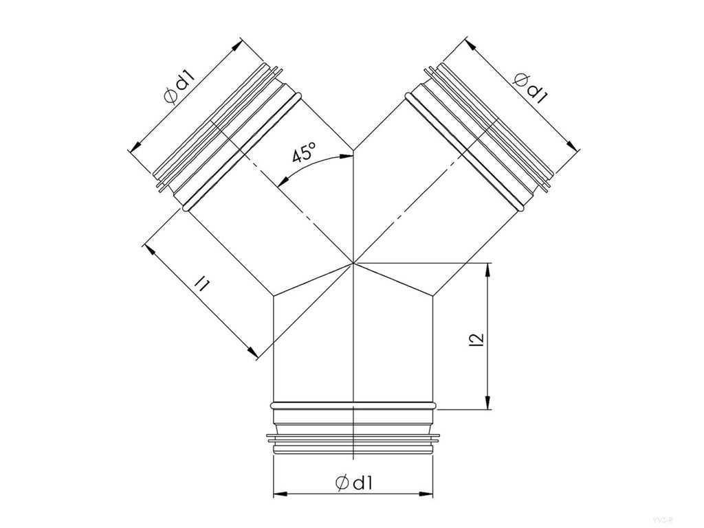 Y-rör 45° (även kallat Y-stycke eller Y-skarv för ventilation) i förzinkat stål med integrerade EPDM-packningar, avsett för ventilationskanaler och spirorör. Y-formen ger en effektiv och mjuk förgrening av luftflödet med lägre tryckfall jämfört med skarpare vinklar, vilket gör den idealisk för både tilluft och frånluft.